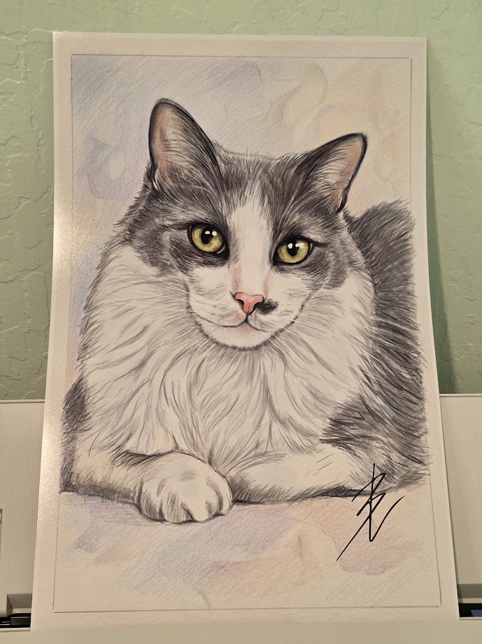Each portrait focuses on capturing the expression and personality of your pet. After the illustration is finished, it can be delivered as a high-resolution digital file or printed as a fine art print (11×17 inches) on professional luster paper, which has a soft surface and beautiful color depth.